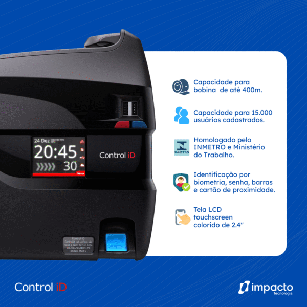 O Relógio de Ponto IDClass Bio da Control iD é um equipamento biométrico com tecnologia avançada de reconhecimento por impressão digital, que assegura precisão, segurança e conformidade com a Portaria 671/2021 do Ministério do Trabalho e Emprego (MTE). Seu design robusto e compacto alia funcionalidade e durabilidade, considerando o uso intenso em ambientes corporativos.